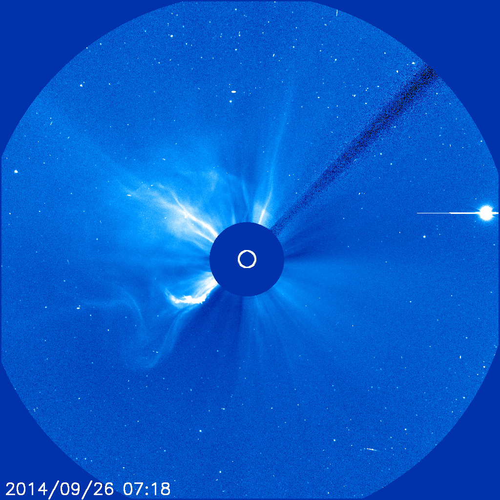 Övervakningen av vår egen stjärna var överskriften för lektionen med nämnda grupp den 26:e september. Jag berättade inledningsvis om några betydelsefulla satelliter, vilken information de ger och hur man kommer åt informationen. När jag visade en färsk bild tagen av ESA´s och NASA´s gemensamma satellit SOHO syntes en en stark ljuskälla i kanten av bilden.