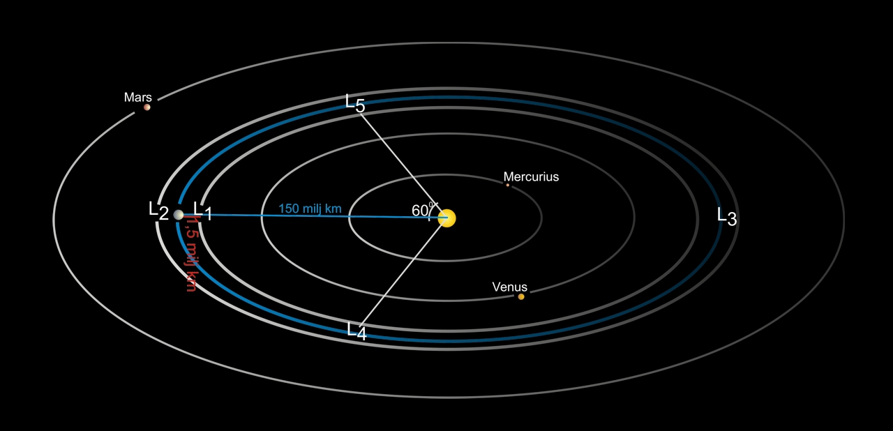 Vanligen tänker vi på satelliter som nyttiga tekniska prylar som snurrar runt vår jord. Så gör också de flesta – även de geostationära – vilket beskrivs i tidigare text här på EduGalaxen. Det finns dock fem områden i vilka vi kan placera satelliter så att de, relativt jorden, med väldigt små åtgärder kan hållas på samma ställe hela tiden. Dessa områden är de vi kallar Lagrange-punkter efter astronomen och matematikern Joseph-Louis Lagrange.