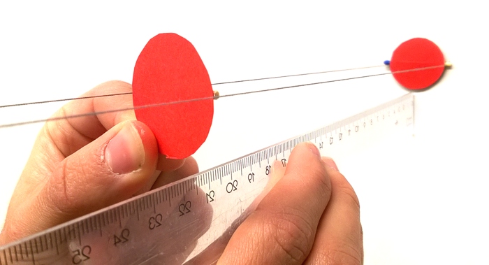Snöret som är fastknutet i tändstickan som är limmad fast på den ena ”månen” kommer att visualisera den vinkel i synfältet som månen fyller. Vinkeln är exakt densamma på alla skalenliga modeller – samma vinkel som i verkligheten. Om snöret vi använder i detta fall är 2 ggr 384 cm kommer vi att från den vinkel som bildas mitt på snöret när vi sträcker ut det se månen som den ser ut från jorden när avståndet mellan jorden och månen är 384000 km.