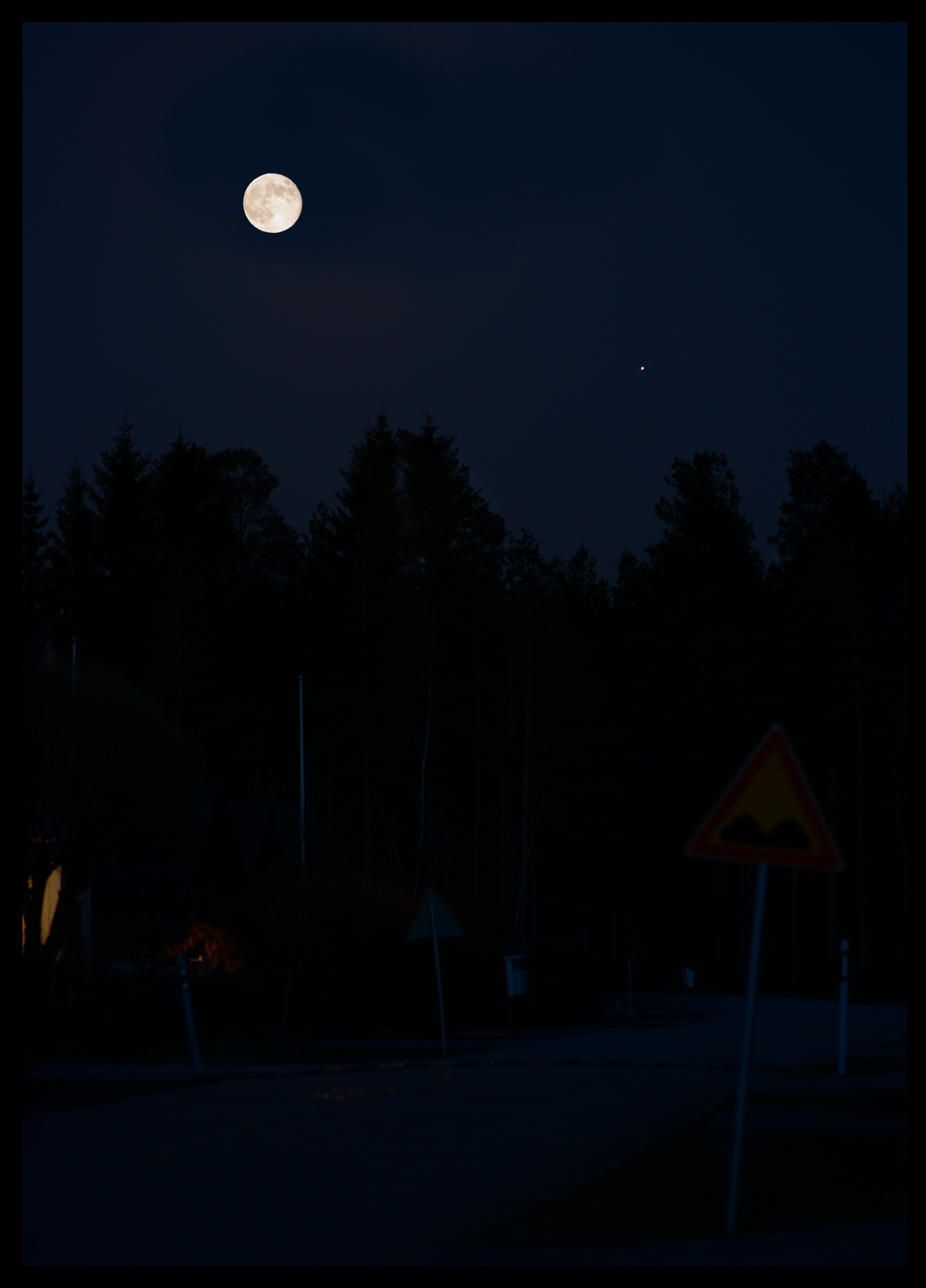 Det är troligt att natthimlen fick sig lite extra uppmärksamhet mellan Valborgsmässoafton och första maj 2018. Dels var Månen full och dels syntes solsystemets största planet, Jupiter, åt samma håll just då. Det är vackert till och med i ett litet bostadsområde när fullmånen strör silver i snåren. Att göra det vackra man upplever rättvisa i bild är något vi alla någon gång brottats med.