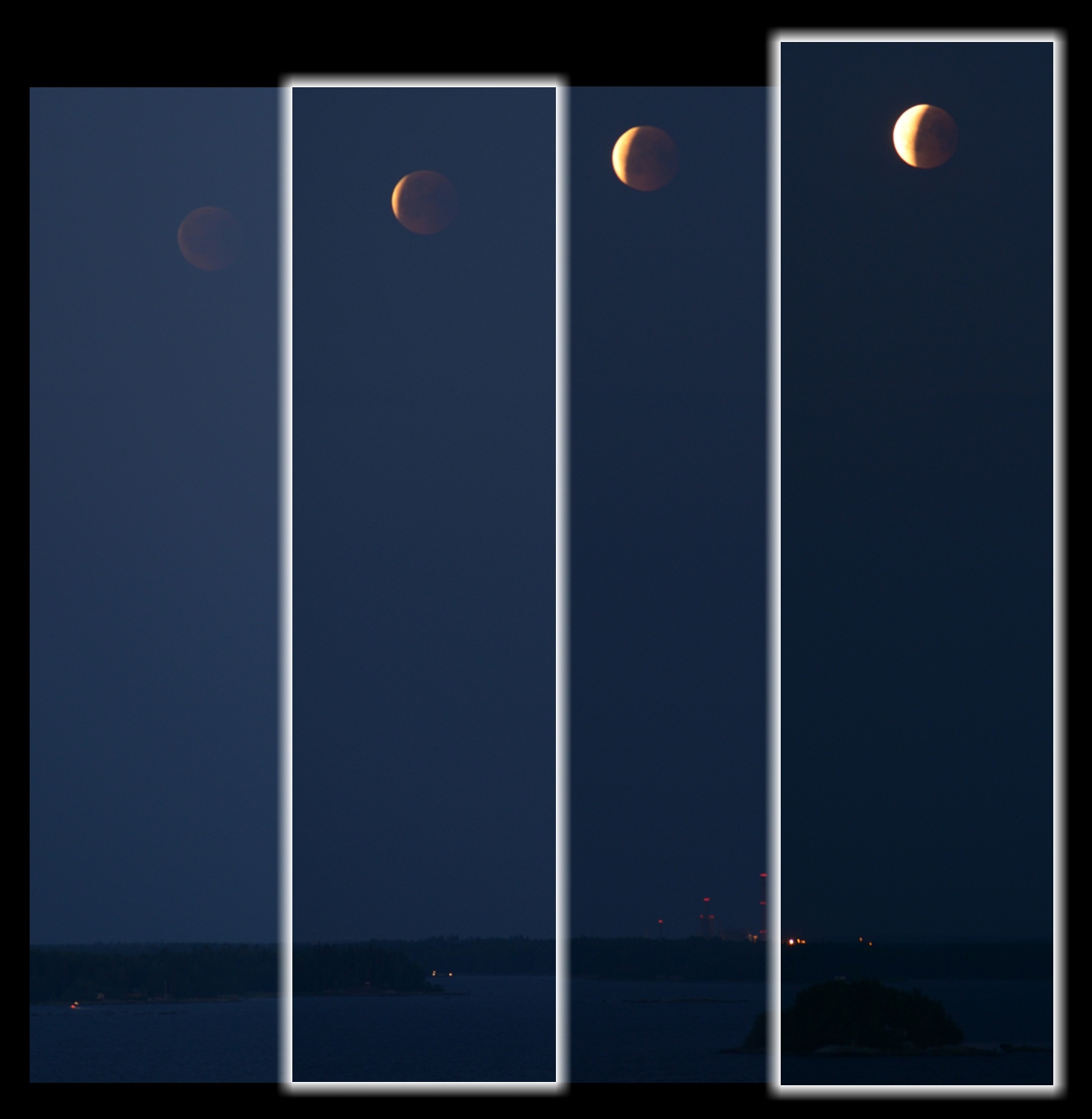 Bilderna i kollaget ovan och bilden av en nästan helt förmörkad Måne är helt obehandlade. Det är så som kameran registrerar omgivningen i en enda enkel exponering. Däremot blir det småningom rätt stor skillnad i hur jag uppfattar bilden och hur kameran registrerar den när Jordens kärnskugga lämnar en allt större del av Månen fri. Det blir till att ta flere exponeringar och bygga ihop en bild av dem för att fånga det jag ser.