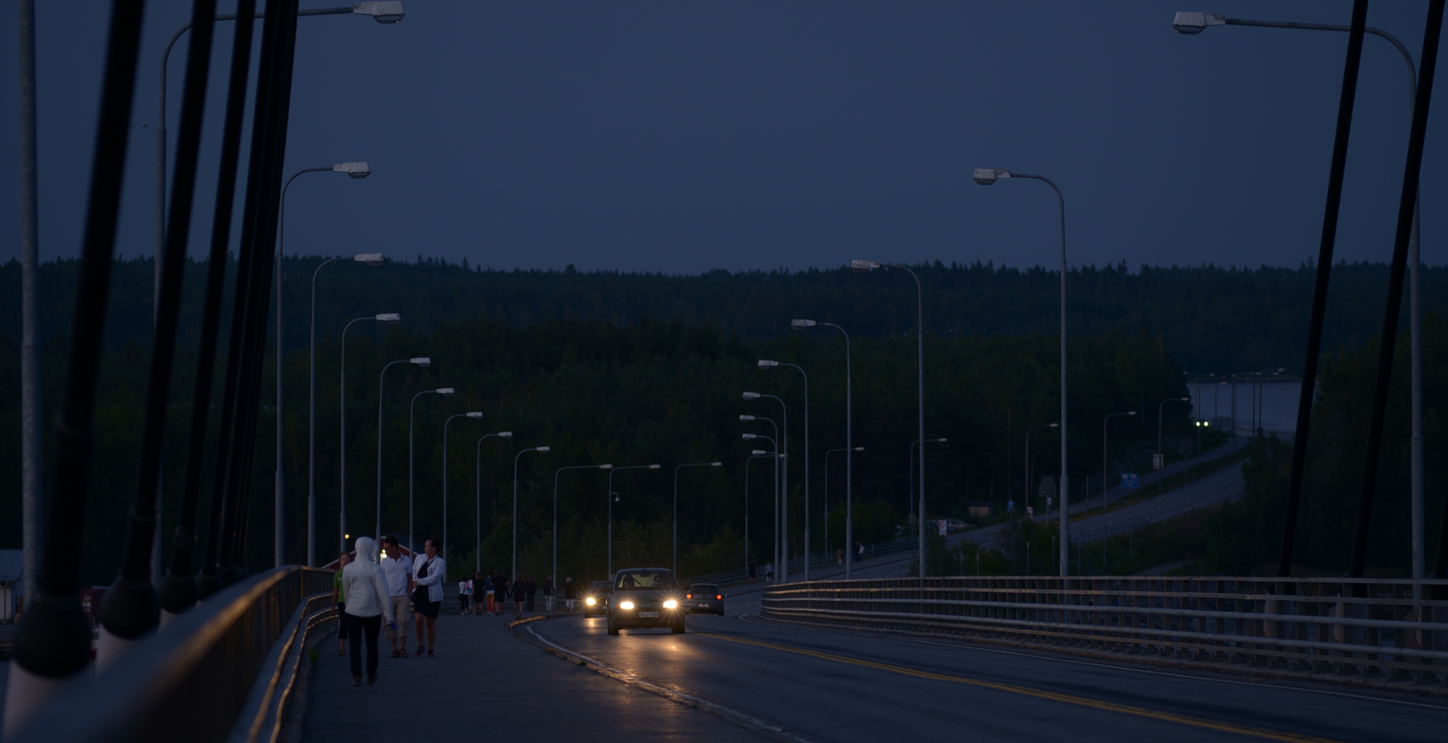 Vid solnedgången går jag upp på Replotbron. Ser misstroget på diset och molnen i sydost och går ner tillbaka för en kopp kaffe. Då går jag definitivt mot strömmen. En halv timme senare går jag tillbaka upp på bron, mot strömmen. Denna gång möter jag människor som fått nog av att vänta i snålblåsten och vänder hemåt tillbaka.