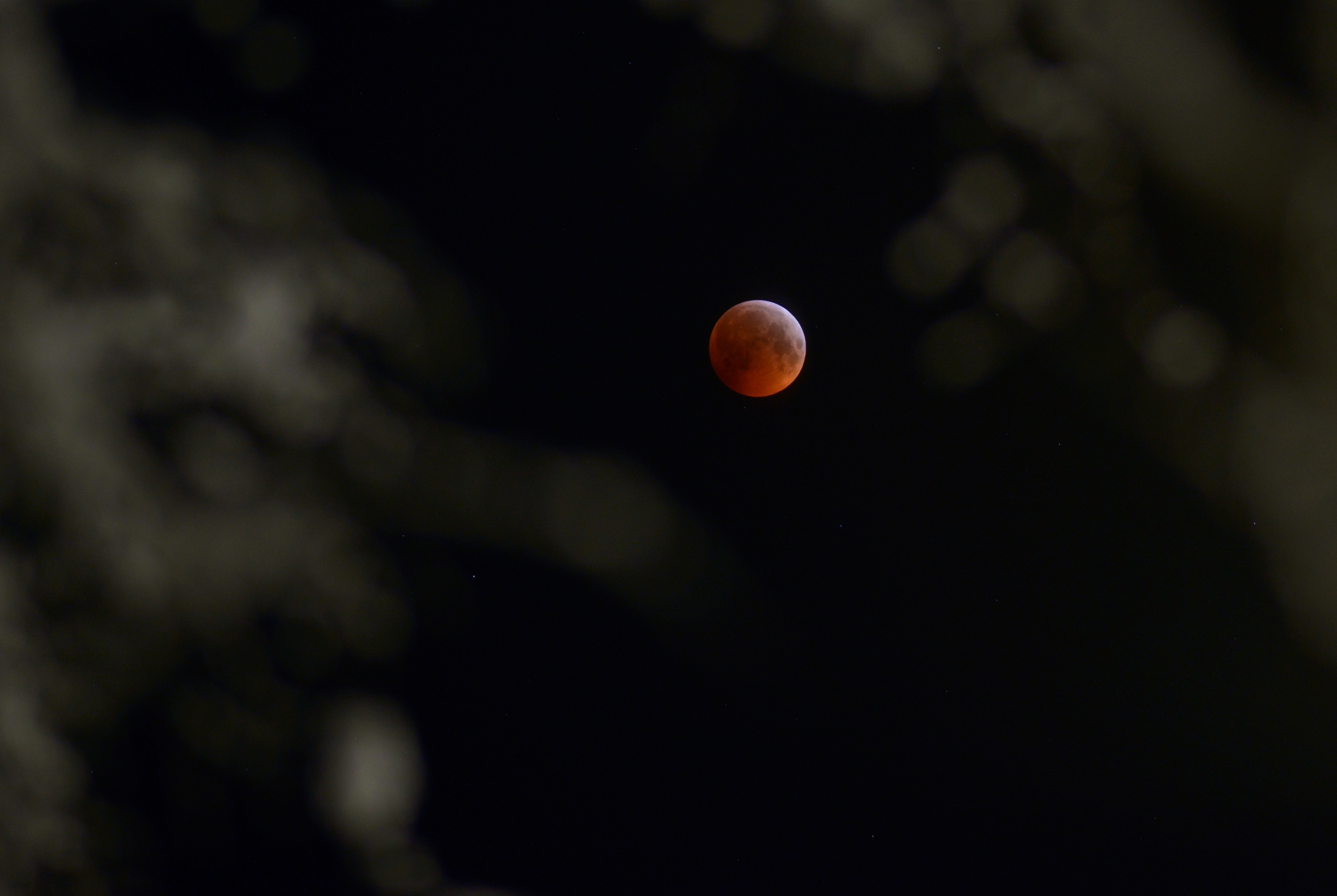 En stund efter att bilden ovan tagits är hela månen blodröd. De observanta iakttagarna noterar att centrum av Jordens skugga rörsig något under Månen sett från våra breddgrader.