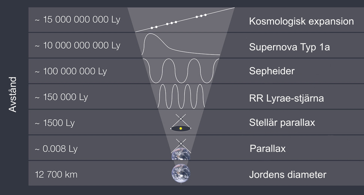 Eftersom de stjärnor som ligger närmast Solen är över fyra ljusår bort är de två första pinnarna i avståndsmätningsstegen oanvändbara. Stellär parallax bygger den perspektivförskjutning som uppstår när vi ser ut mot samma stjärna vid två tillfällen, åtskiljda i tid med ett halvt år. Under det halva året har vår utsiktsplats förflyttats med diametern i Jordens omloppsbana kring Solen. Detta verktyg fungerar på avstånd upp emot 1500 ljusår.