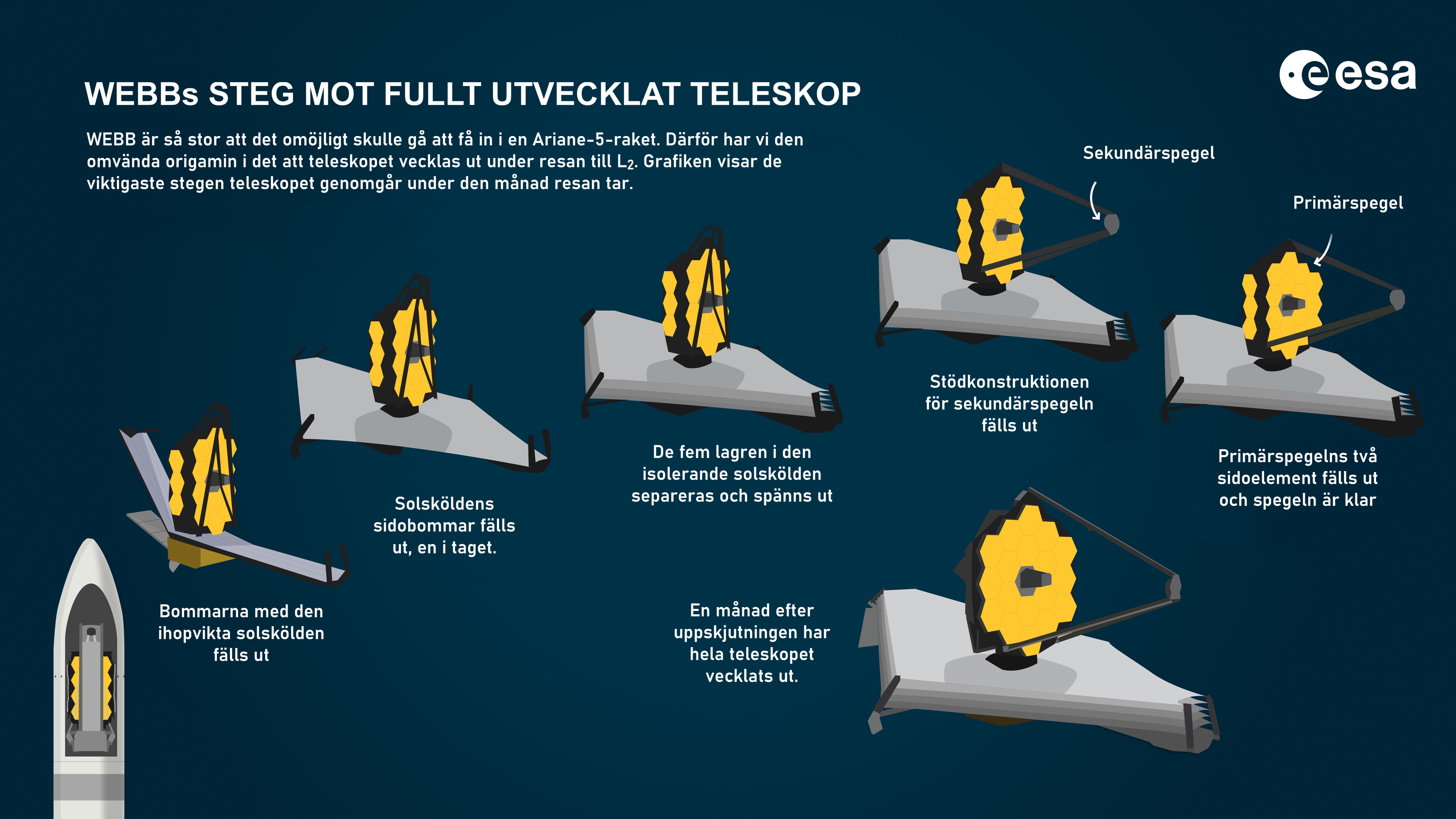 60 timmar efter lift-off utfördes den andra kurs- och fartkorrigeringen, MCCB1b (Mid-Course Correction Burn). Motorerna gick i 9 minuter och 27 sekunder. Nästa gång motorerna körs igång är 29 dagar efter lift-off. MCCB2 sker när teleskopet ska ”parkeras” i sin omloppsbana. Det vi nu har att se fram emot är de olika åtgärder som vecklar ut teleskopet. Det är en hel del – betydligt fler än det som kunde klassificeras som ”lagom spännande” – steg i den utvecklingen, men i korthet beskrivs det bra i ESA‘s grafik:
