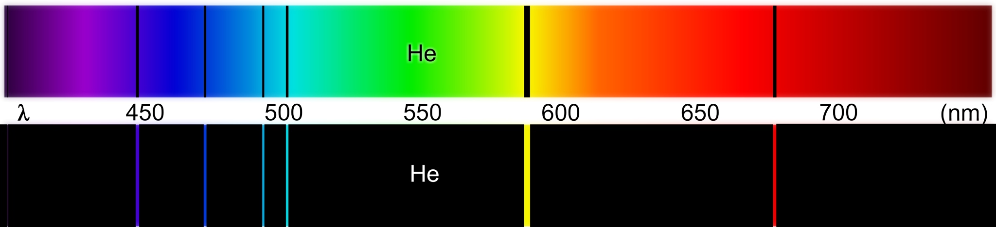Sällan har vi utanför laboratorierna och diverse artificiella belysningskällor en situation med endast ett grundämne att göra. När vi tittar på stjärnorna har vi en hel del olika grundämnen inblandade. De allra första stjärnorna var uppbyggda av väte – rakt igenom. I de första fusionsreaktionerna bildades helium. Då kunde den elektromagnetiska strålningen, ljuset i detta fall, gett upphov till följande emissions och absorptionslinjer: