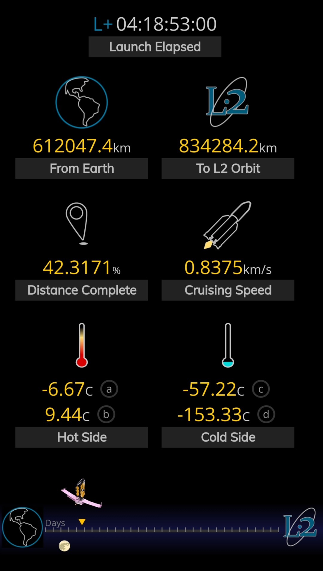 Följ med teleskopets väg på https://www.jwst.nasa.gov/content/webbLaunch/whereIsWebb.html