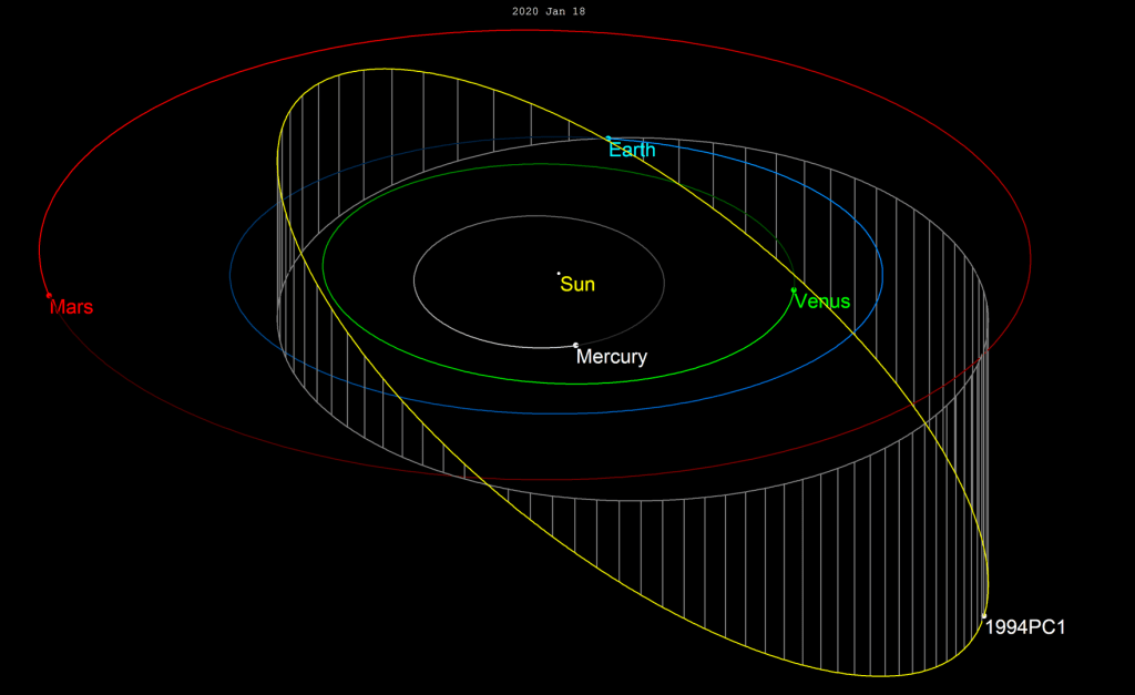 Omloppsbanorna i solsystemet ligger inte alla i samma plan. Den bana 1994 PC1 befinner sig i avviker markant från Jordens omloppsbana. Så även om Jorden och asteroiden skulle hålla samma hastighet, åt samma håll, i sina banor skulle det innebära en katastrof om vi träffade på varandra i korsningsområdet.