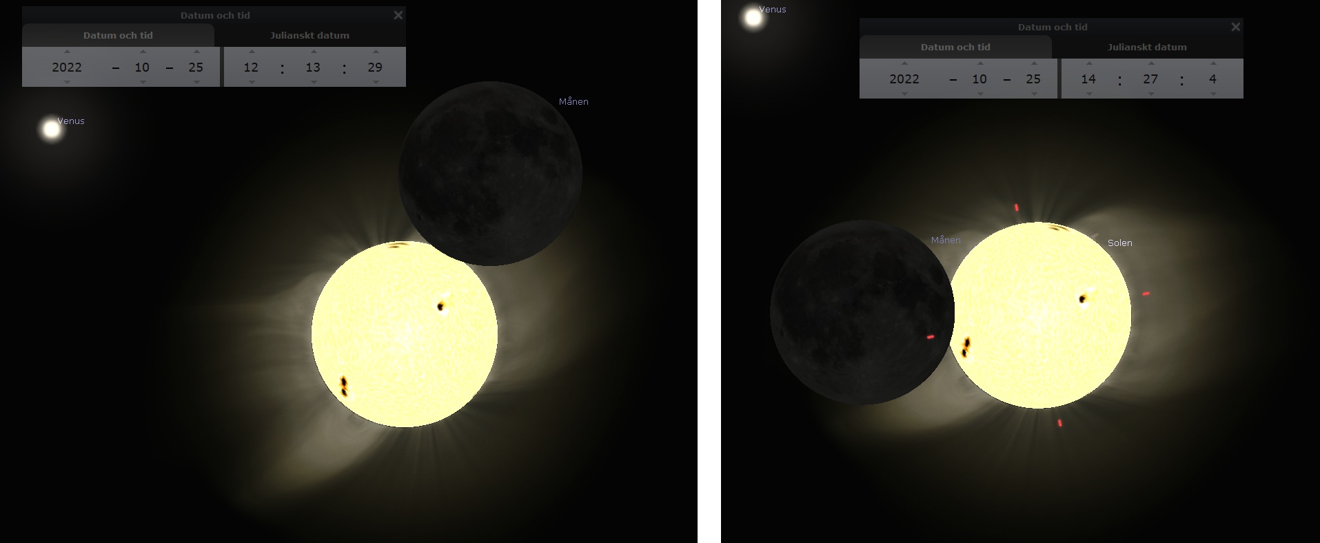 Bilderna ovan visar hur den inledande och avslutande fasen av förmörkelsen ter sig från Helsingfors. Klockan 12:15 ser man redan en liten ”tugga” fattas Solen. Sedan har man tid på sig att studera fenomenet fram till halv tre på eftermiddagen. Det är bra att komma ihåg att Jorden roterar under Månens skugga. Det gör att alla tidsangivelser är lokala.