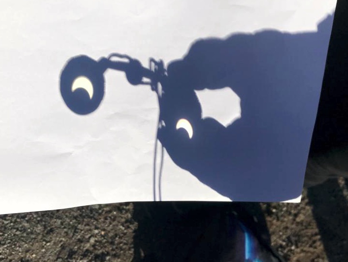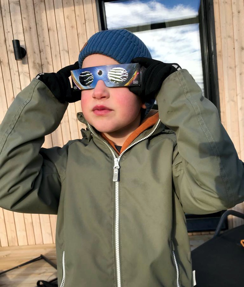 Bilden till vänster tog Teodor Mattbäck genom solteleskopet. Björn, på bilden till höger, hade tagit sina egna solförmörkelseglasögon med sig till Bennäs skola. Hans glasögon användes flitigt också av förskolans elever.
