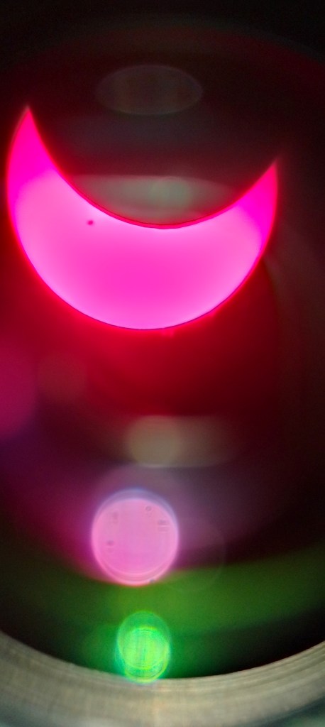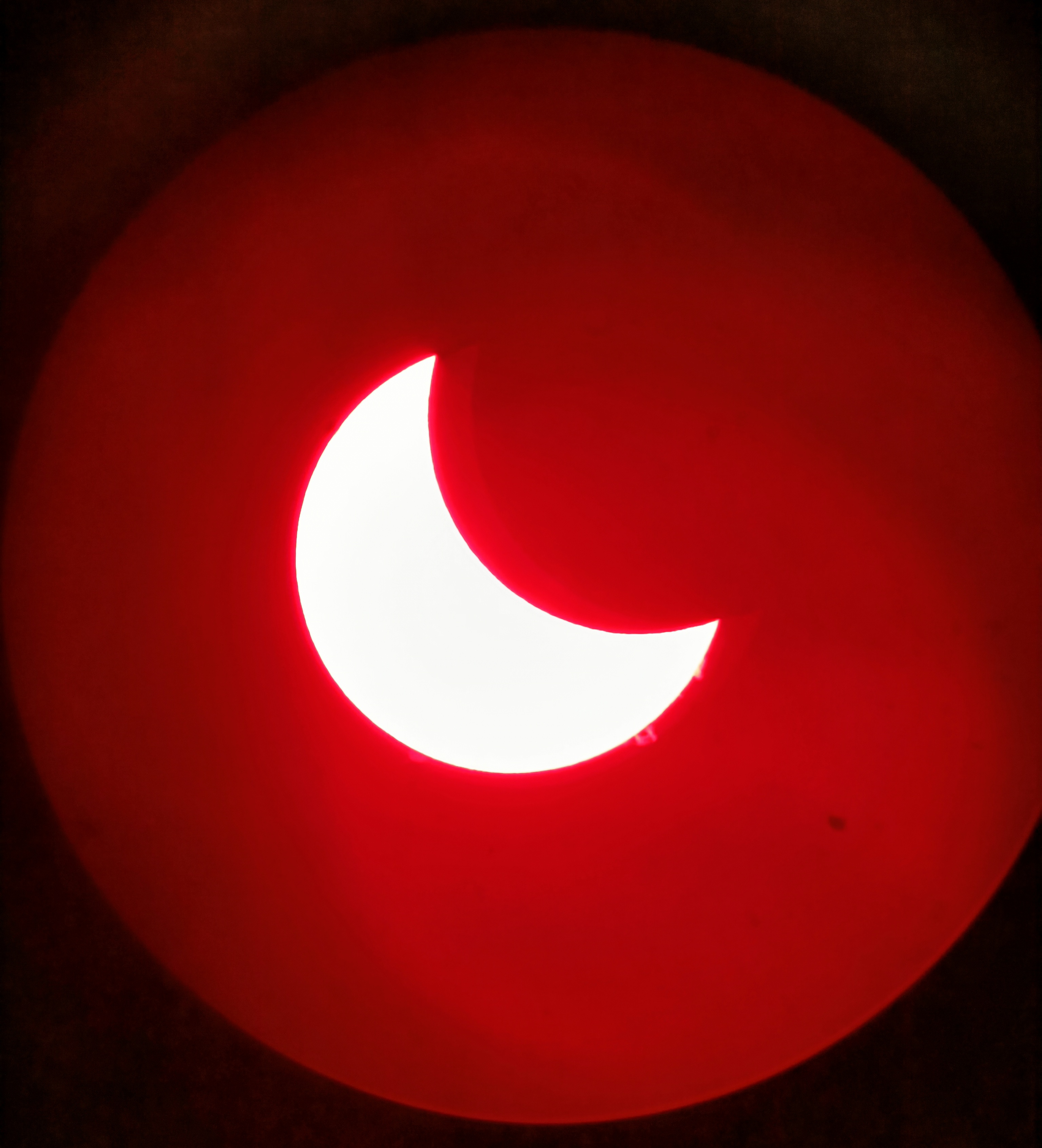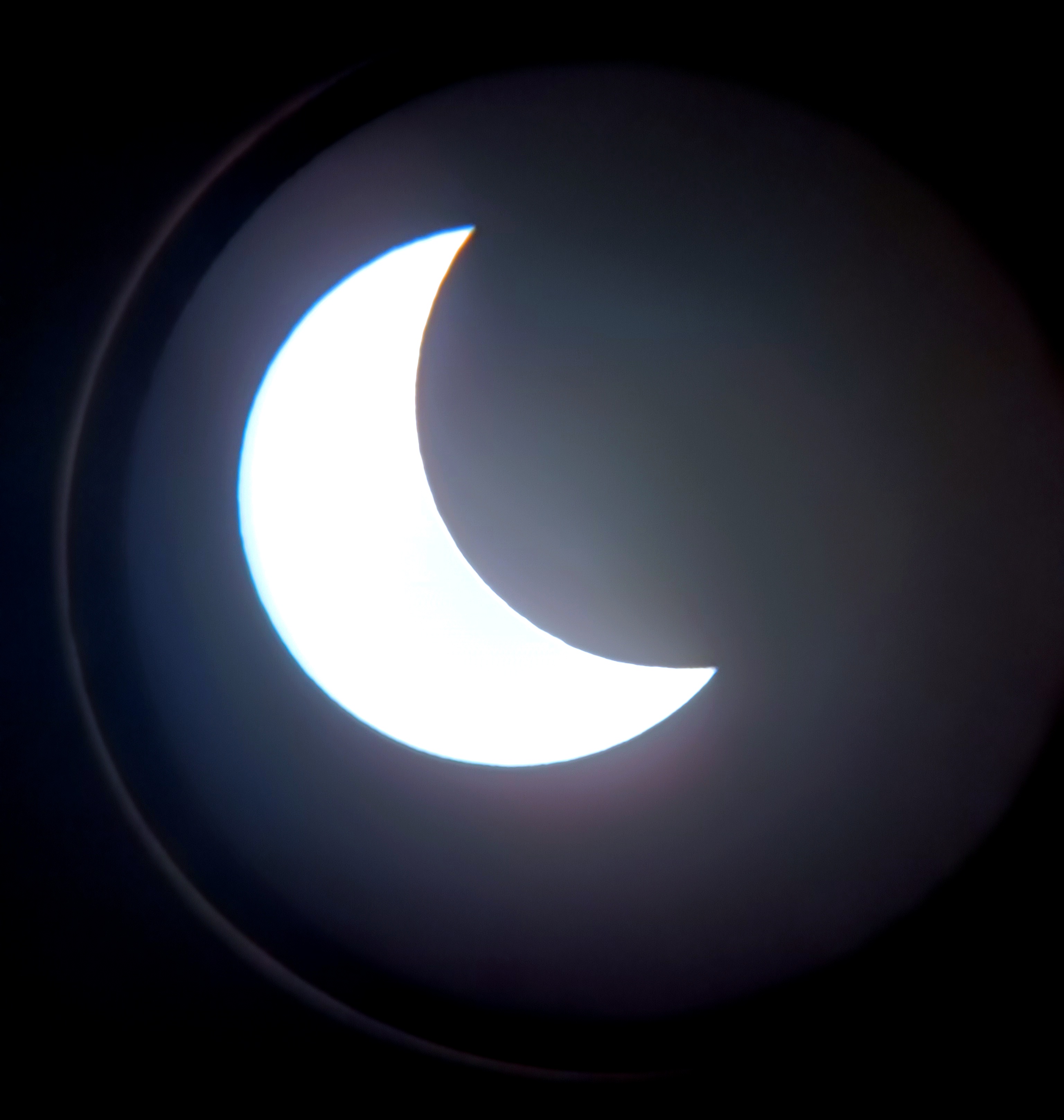 Ett teleskop med solfilter gör att man kan följa med Månens rörelser i förhållande till Solen – i detalj – i och med att solfläckar kan utgöra extra referenspunkter. Under denna solförmörkelse var det dock så pass få och små solfläckar att den idén fick ligga. Hur som helst gav teleskopet möjligheter att följa förloppet ”i närbild”.