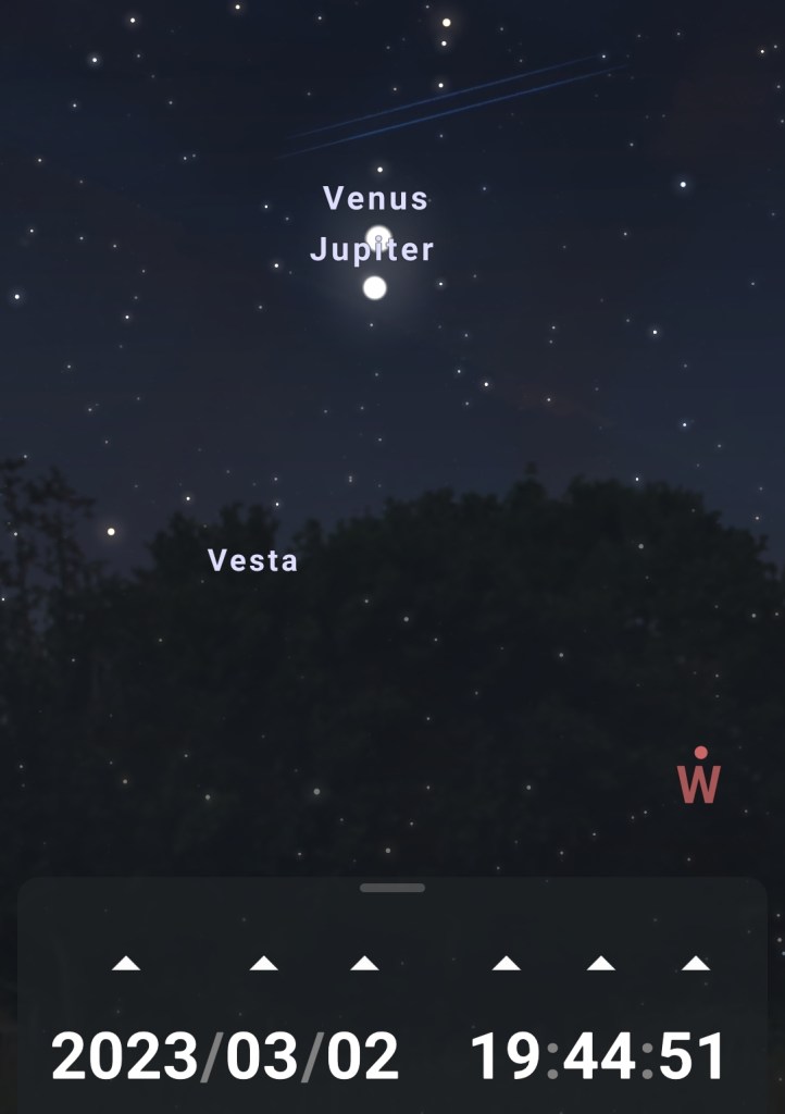 I början av mars (månaden – inte planeten) 2023 ses Venus och Jupiter i samma riktning. Från Jorden.