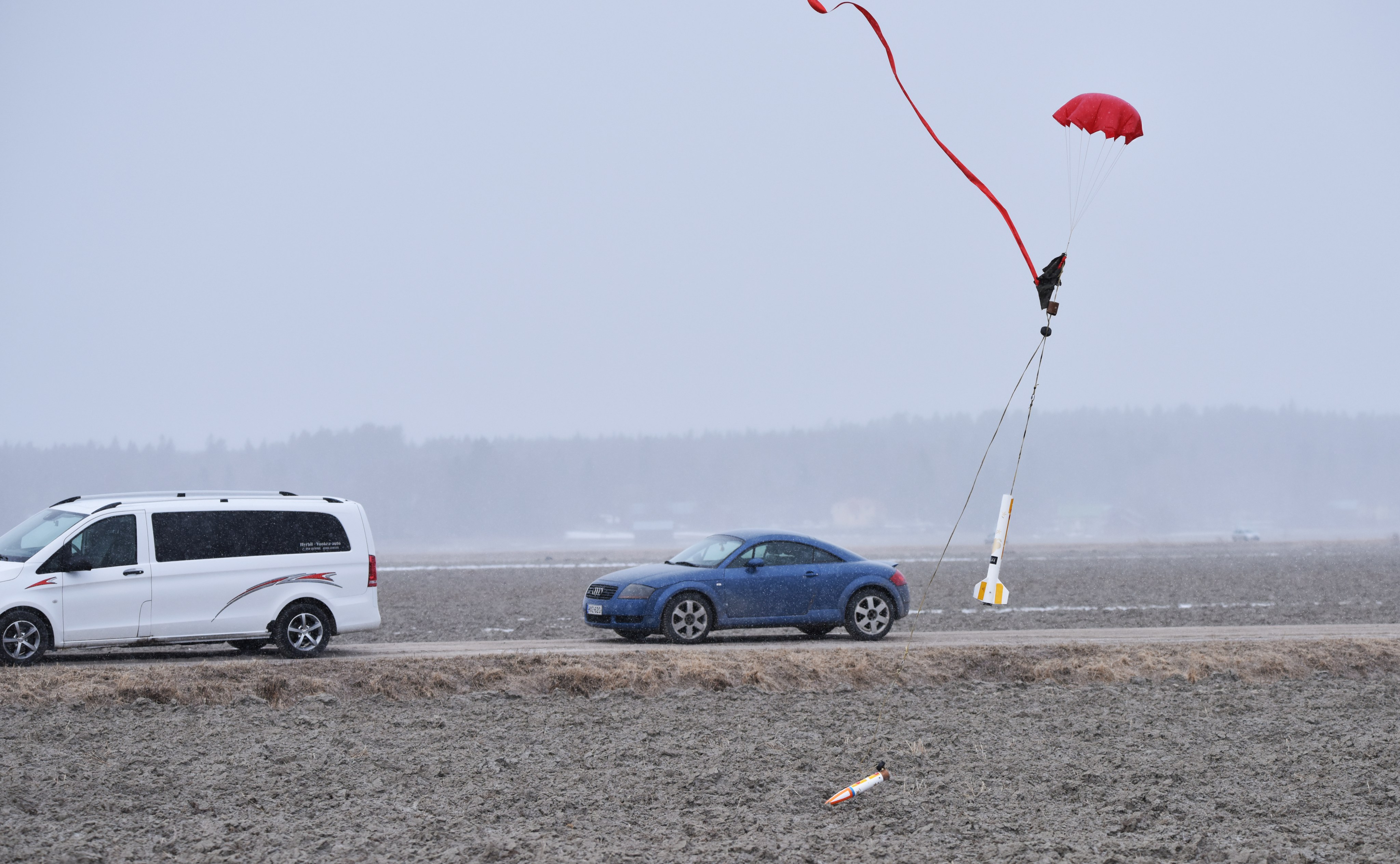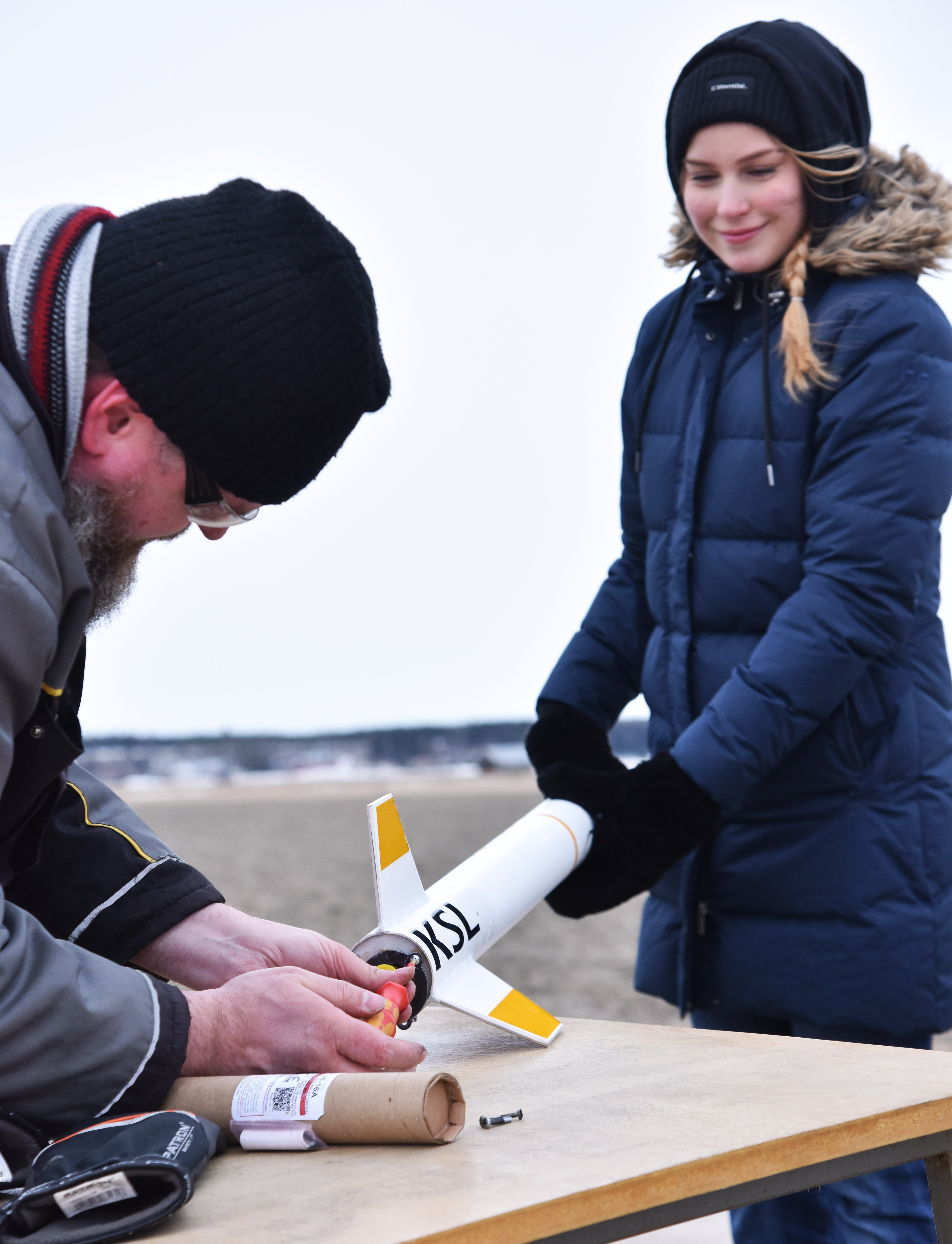 Fredag 5.4.2024 var tillägnad den aktivitet de flesta inblandade ser fram emot allra mest. Det är då som ”The rocket boys”, Sällskapet för Astronautisk Forskning i Finland, gör det de gillar mest; Sänder raketer. Under fredagen fick de CanSats som sändes iväg innan ett lätt snöfall drog in skjuts upp till höjd på drygt 1000m. I år erbjuder ”The Rocket boys” därtill varje lag en egen raket som de sedan får ge en personlig touch.