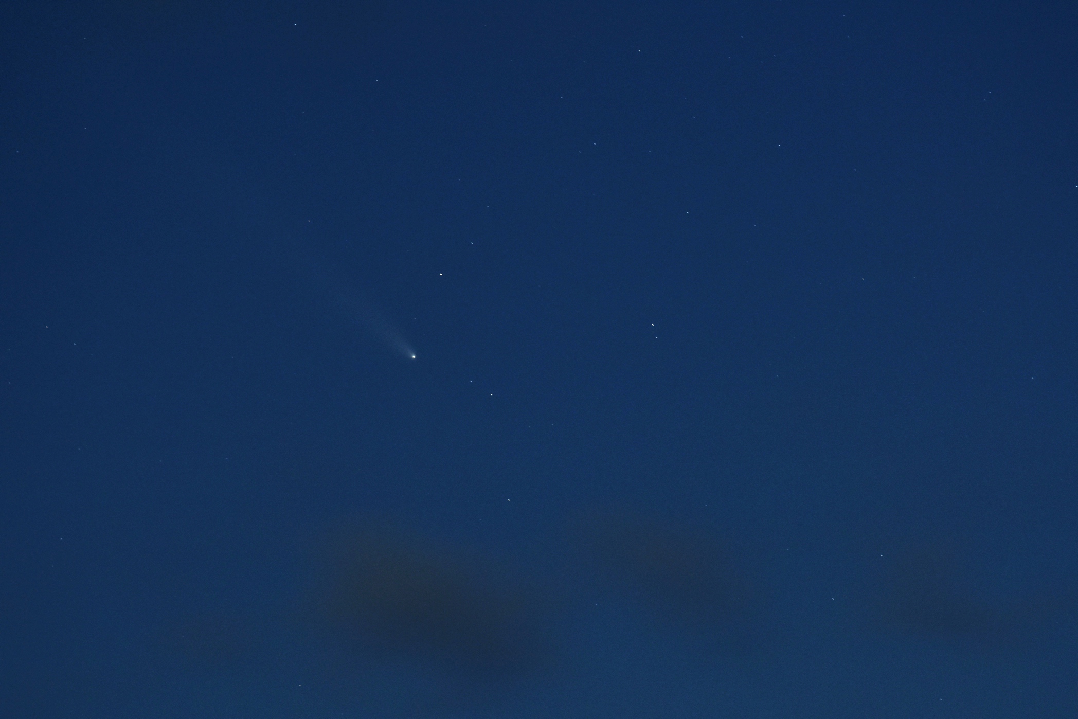 För att få en bra bild är det gott att ha något i förgrunden. Någon vulkan eller katedral fanns inte att tillgå. Jag inväntade det tillfälle när kometen skulle närma sig skogskanten. Det var bara det att när kvällen gått så långt drog diset in och förtog lystern i kometsvansen i det närmaste totalt.