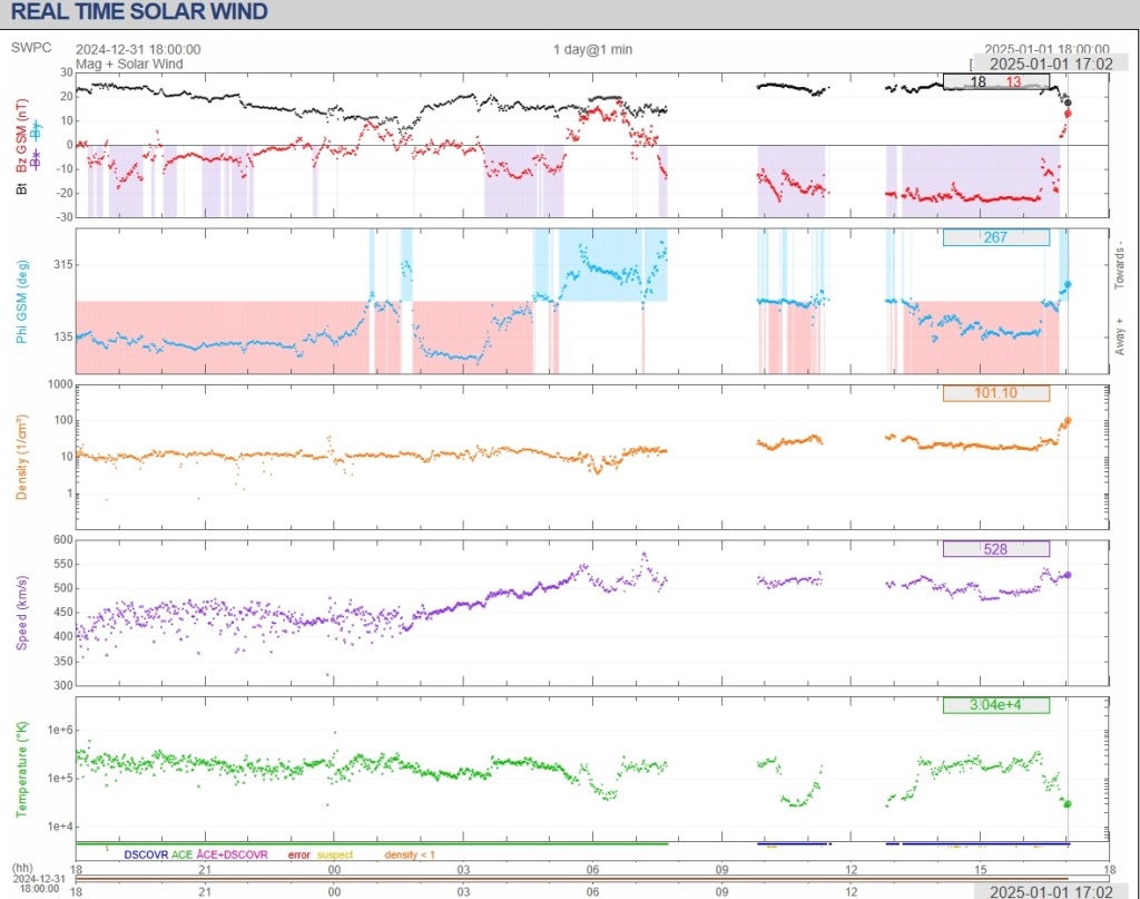 Därav dog norrskenet ut rätt snabbt efter halv åtta, finsk tid. Tidsangivelserna i diagrammet från Space Weather Prediction Center är i UTC. Därtill bör man komma ihåg att mätningarna görs en och en halv miljoner kilometer närmare solvindens källa.