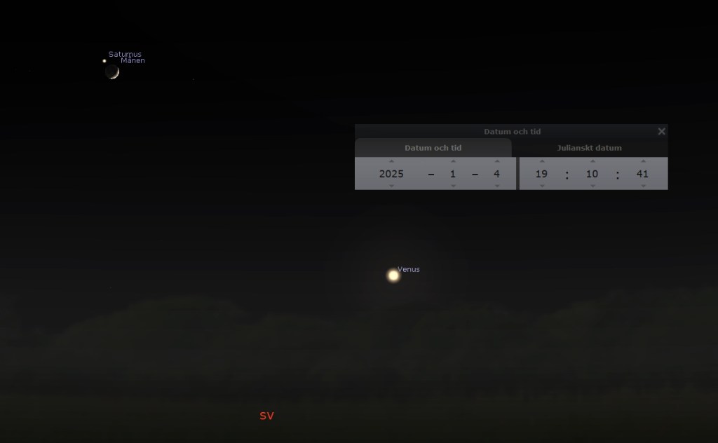 När nymånen sakta drar fram över scenen döljer den ibland nå’t annat. Den fjärde januari var det Saturnus som hamnade bakom Månen strax efter kl 18 CET. De som hade fri sikt mot horisonten i väster kunde också se skedet när Månen dragit förbi och Saturnus ”återvände” en och en halv timme senare.