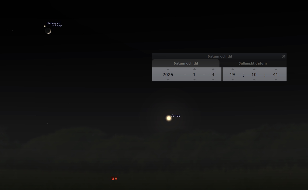 När nymånen sakta drar fram över scenen döljer den ibland nå’t annat. Den fjärde januari var det Saturnus som hamnade bakom Månen strax efter kl 18 CET. De som hade fri sikt mot horisonten i väster kunde också se skedet när Månen dragit förbi och Saturnus ”återvände” en och en halv timme senare.