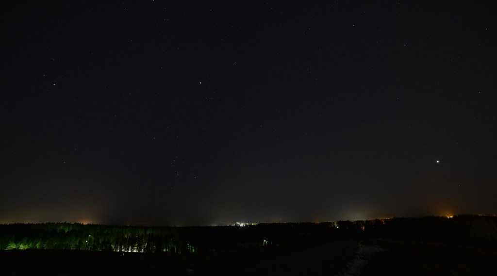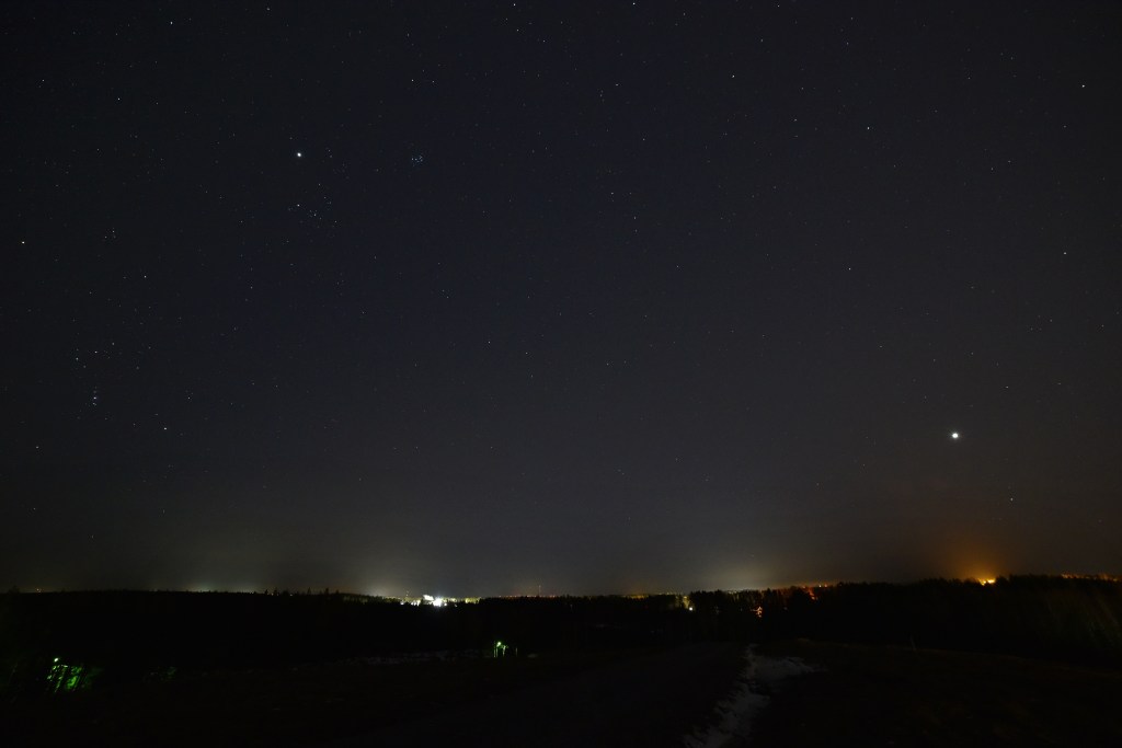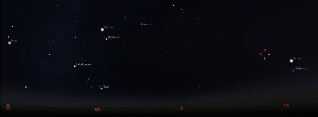 Plejaderna, Betelgeuse och Orions bälte är med som referenspunkter. Neptunus kan inte ses utan optiska hjälpmedel. Det är än svårare när den syns så kort tid efter skymningen.