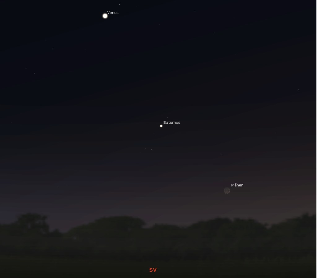 Den första februari kommer Månen att befinna sig mellan Saturnus och Venus. Då hinner bakgrunden bli tillräckligt mörk för att man tydligt ska se också Saturnus. Månen är vid den tiden blott en skära och stör på intet sätt nattsynen.