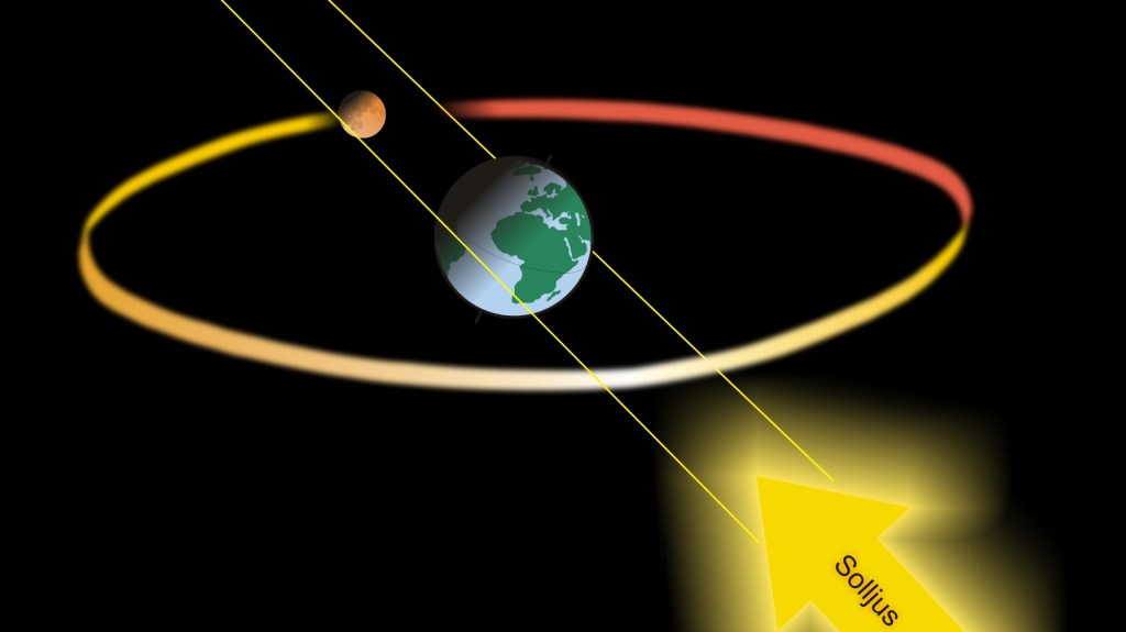 En månförmörkelse uppstår när Solen, Jorden och Månen ligger i linje med varandra. I den ordningen. Den ”strut av skugga” som Jorden ger upphov till kommer under en total månförmörkelse att för en liten stund helt täcka Månen.