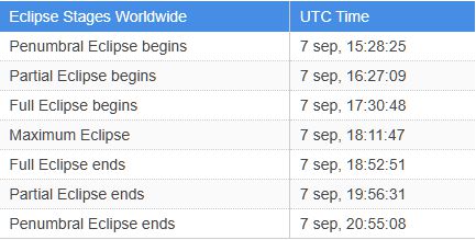 Tiderna ovan är UTC. Lägg till två timmar för CET och tre timmar för EET. M.a.o. kommer man att 19:30 från Sverige och 20:30 från Finland kunna se den fullständiga förmörkelsen inledas. Förutsatt att molnen håller sig borta från himlen i sydost. Det kan också vara vanskligt att få syn på Månen eftersom det då ännu inte är mörkt.