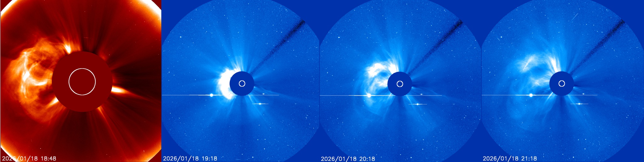 Bildserien ovan visar det koronamassutkast som ledde till det kraftiga norrsken som den 20.1.2026 kunde ses ända söder om 50:e breddgraden. Bilden längst till vänster är tagen med LASCO C2 och visar regionen närmast Solen. De följande tre är tagna med LASCO C3 vars bildvinkel sträcker sig 30 solradier ut från Solen. Tiden mellan de två första bilderna ovan är 30 minuter. Tidsdifferensen mellan bilderna från LASCO C3 är sedan en timme. Med tanke på att vi kan se den yttersta delen av partikelstormen nå bildens kant på mindre än fyra timmar kan vi uppskatta dess minimi-medelhastighet under de första timmarna. (Varför ”minimi-”)