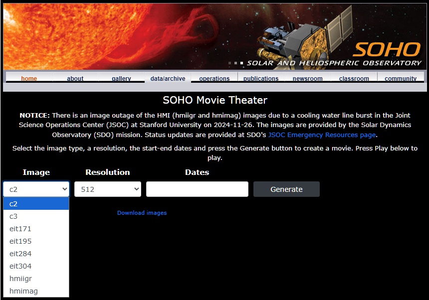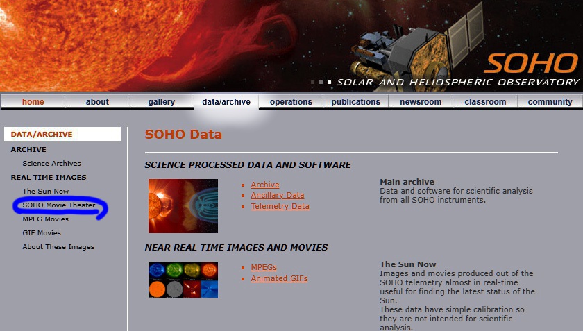 Gå in på SOHO’s webbsida. Välj data/archive i menyraden uppe på sidan. Välj därefter SOHO Movie Theater från menyn till vänster.