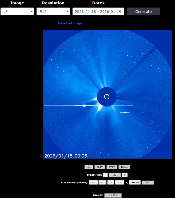 Skärmdumpen nedan visar hur jag valt LASCO C3, bildstorleken/upplösningen 512×512 pixlar och sedan klickat in 18:e till 19:e januari 2026 i kalendern