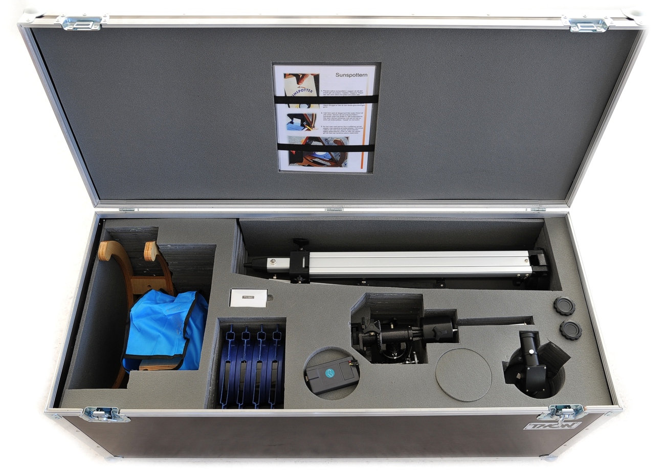 Kofferten beslöts innehålla utrustning för studerandet av samma fenomen som utrustningen i norska originalkofferten. Däremot beslöt vi ersätta solteleskopet med ett enkelt teleskop av Maksutov-Cassegrain-typ. Det teleskopet, försett med solfilter, är lätt att använda för eleverna när de ska studera solfläckar. Därtill kan teleskopet användas också för att studera t.ex. planeter på natthimlen. Teleskopet är försett med rödpunktssikte för att lätt hitta mål på natthimlen.